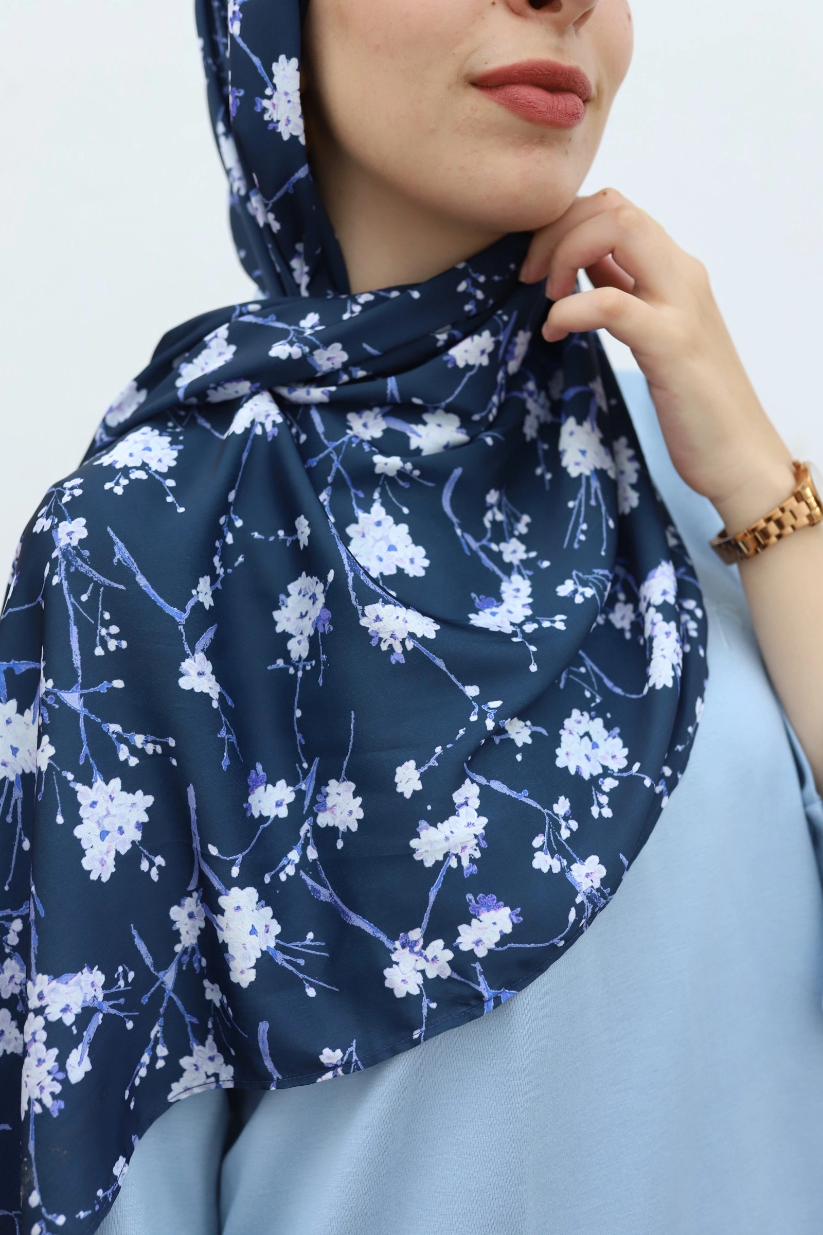 Add a touch of refinement and softness to your outfit with the Navy Blue Chiffon Hijab with White Sakura Flowers.