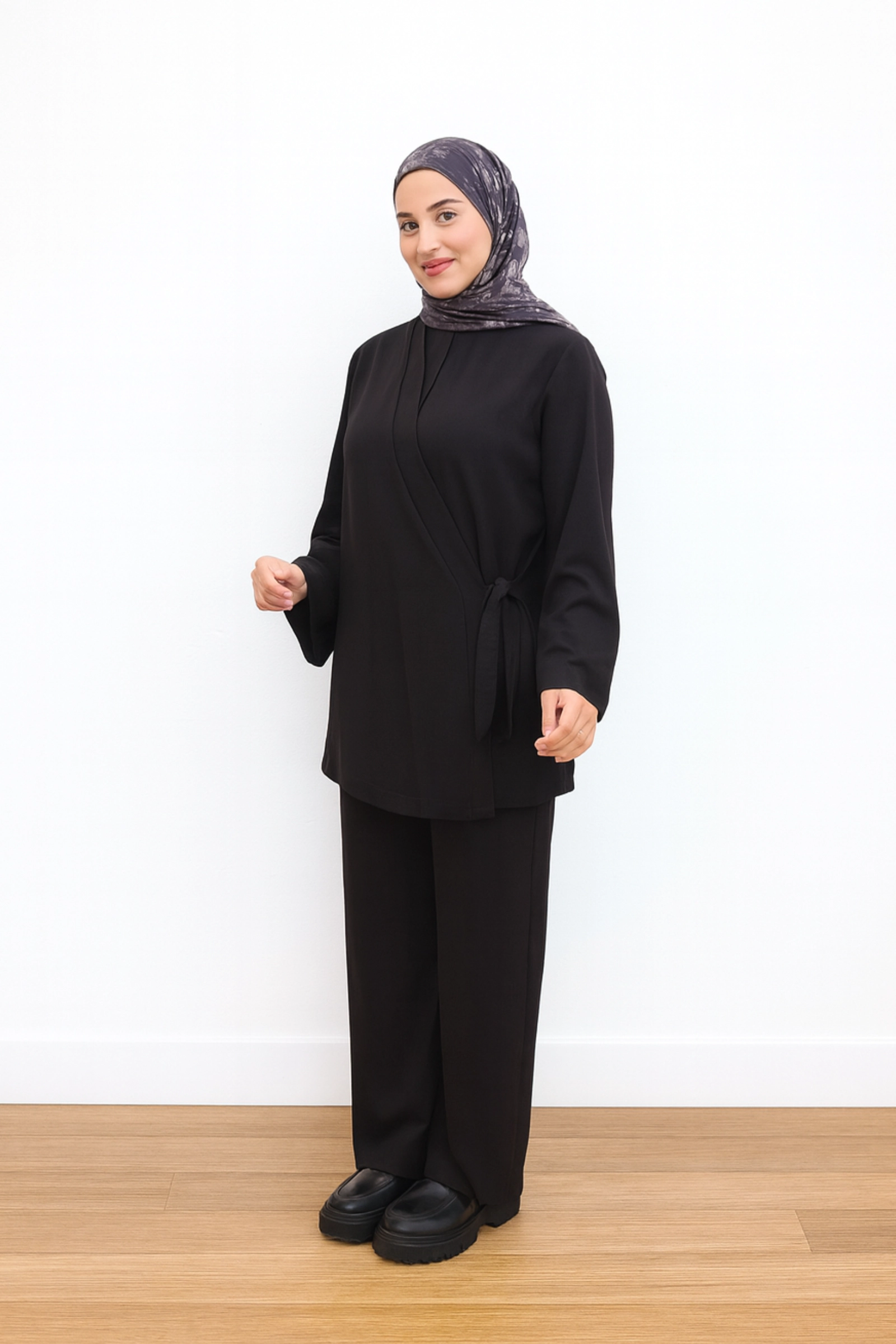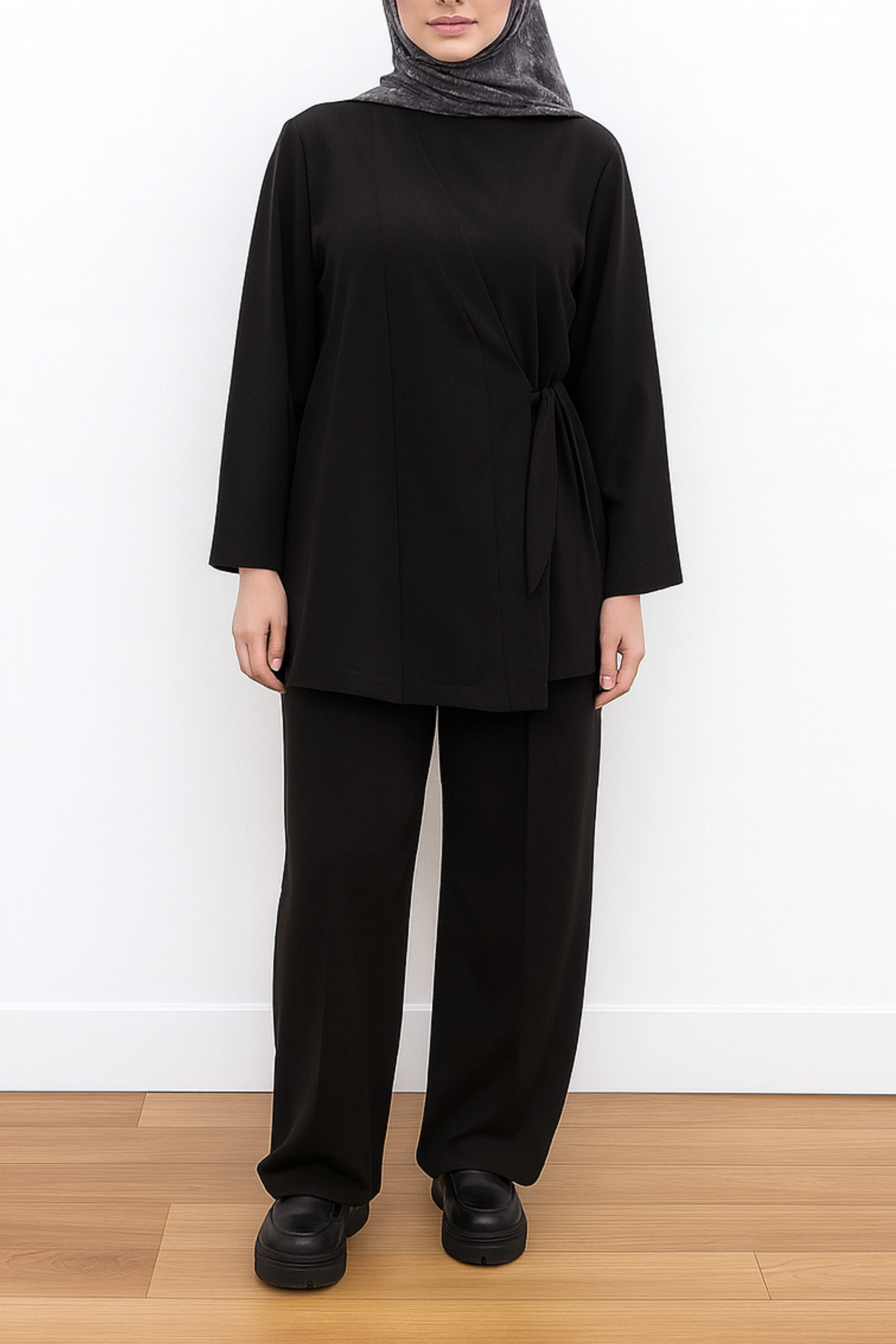 Upgrade your wardrobe with the Black Trend women’s knitwear set. This stylish two-piece includes a mid-thigh long sweater with wide sleeves and an elegant waist tie, perfectly matched with wide-leg pants for a modest yet modern silhouette.