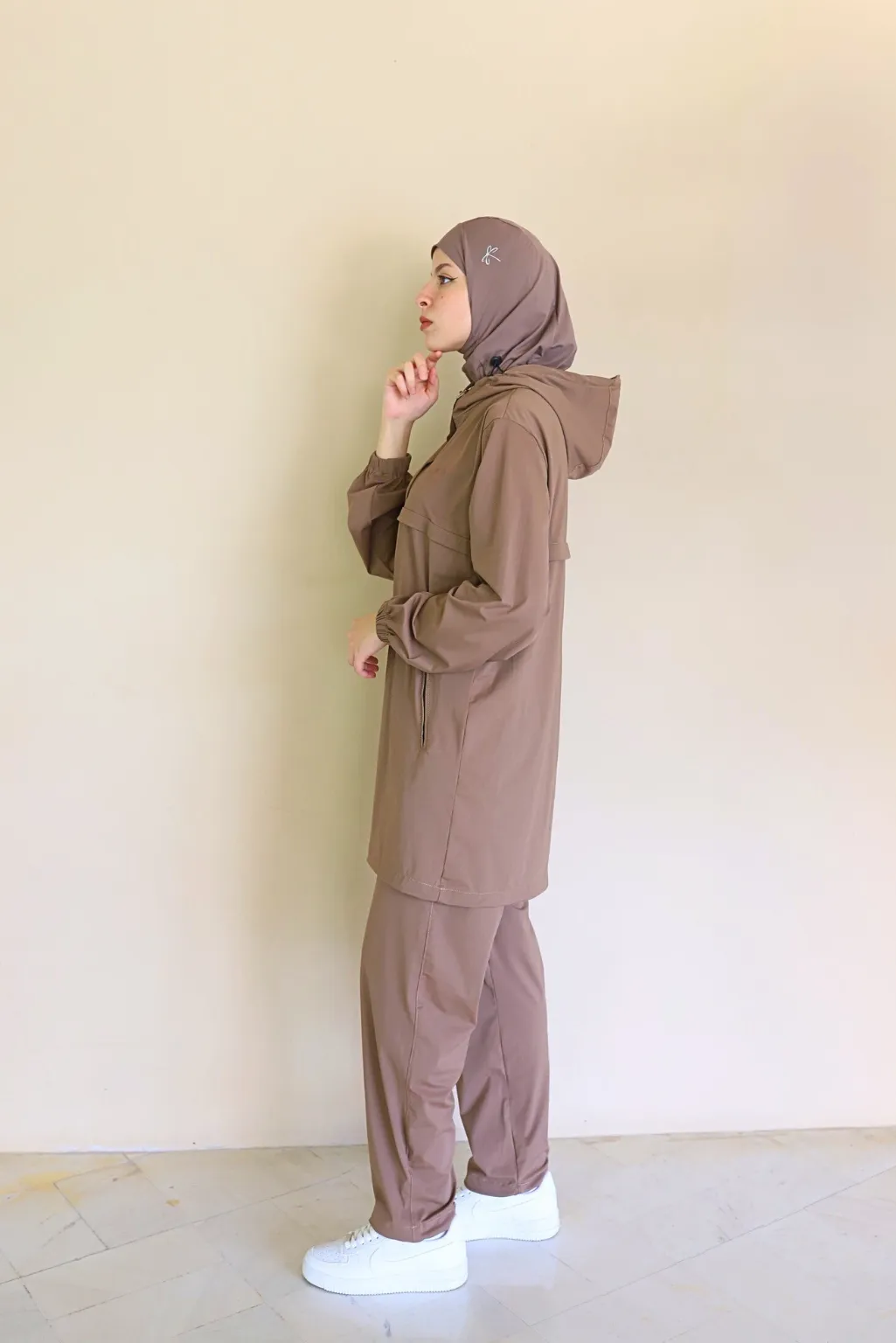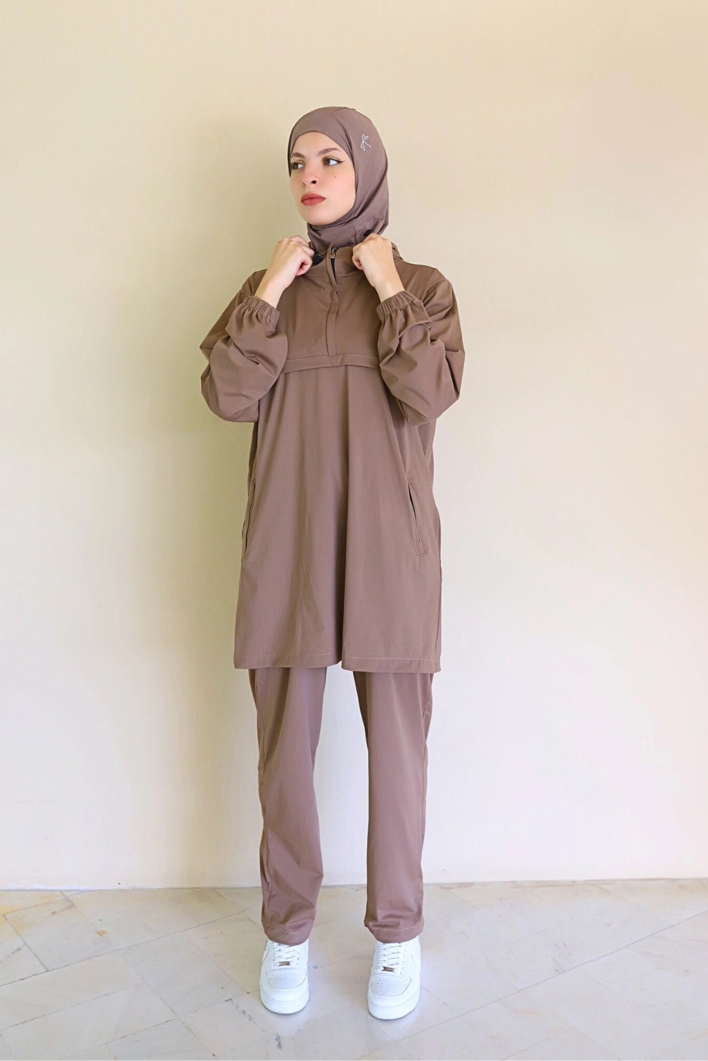 Ce survĂȘtement femme voilĂ©e marron se compose dâun haut long zippĂ© avec capuche ajustable et poignets Ă©lastiques pour un maintien parfait.