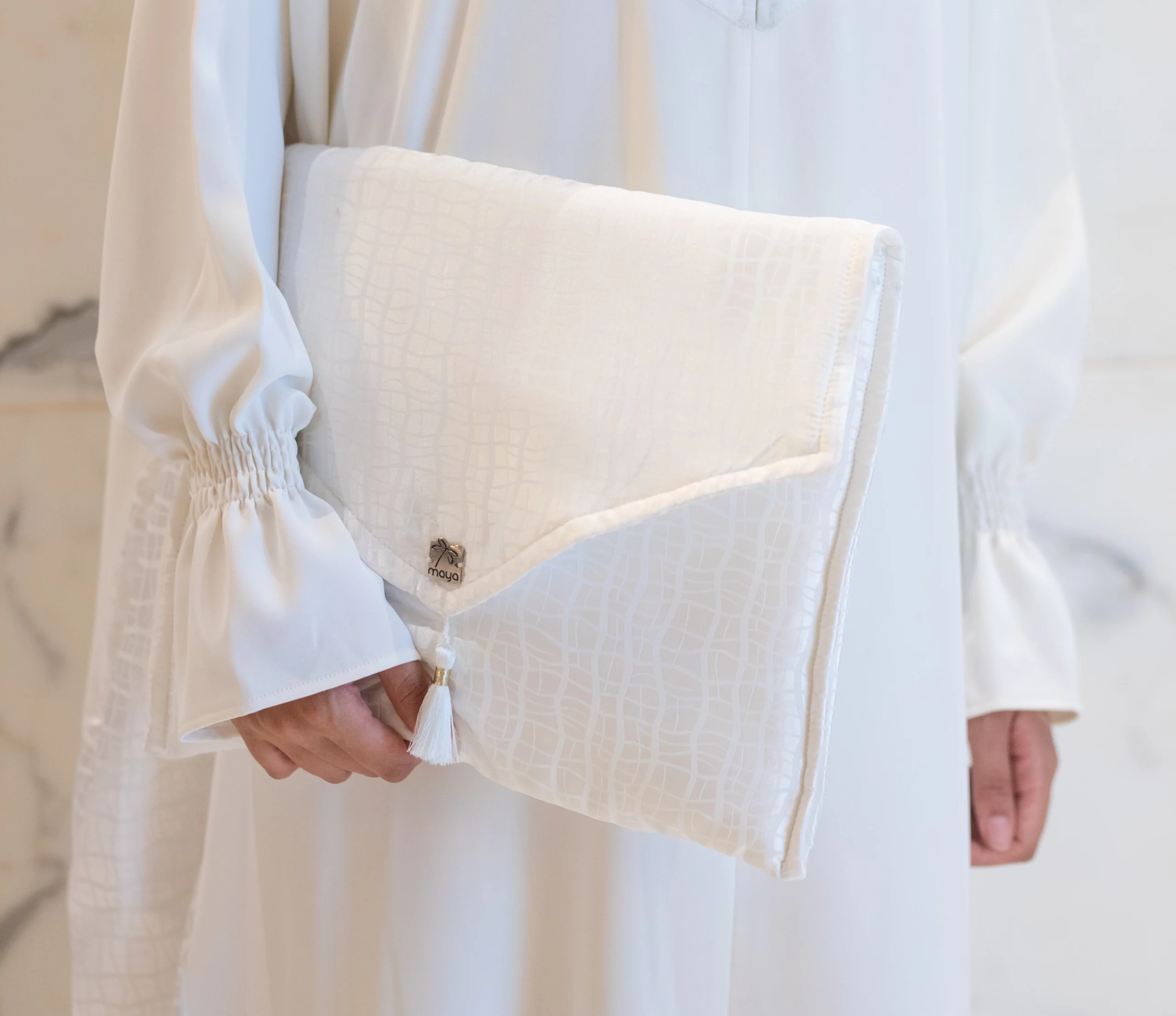 Nous vous offrons une pochette de la même couleur et du même tissu que votre tenue de prière. Pratique et élégante, elle permet de protéger et préserver votre tenue, que ce soit lors de vos déplacements, pour l’Omra, le Hajj ou tout simplement à la maison.